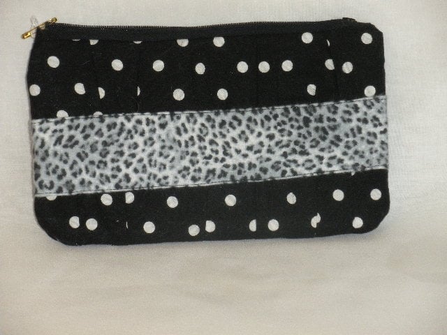 A cute cosmetic bag or clutch with a coordinating center band of animal print over gathered black and white polka dot fabric. It has a zippered closure and a divider on the inside to separate your items.