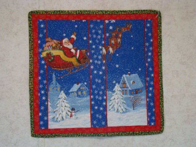 Quilted 2 panel wall hanging of Santa flying with his reindeer in the softly falling snow.