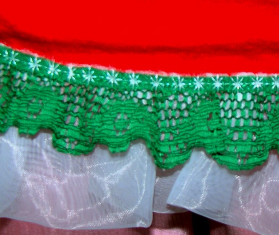 T-shirt is embellished with embroidery on the chest and a double ruffle at the hem. The embroidery is a modern Christmas in green. The double ruffle is a layer of white organza with a layer of green lace. And to make it extra cute it has white glimmer snowflakes at the top of the green lace.